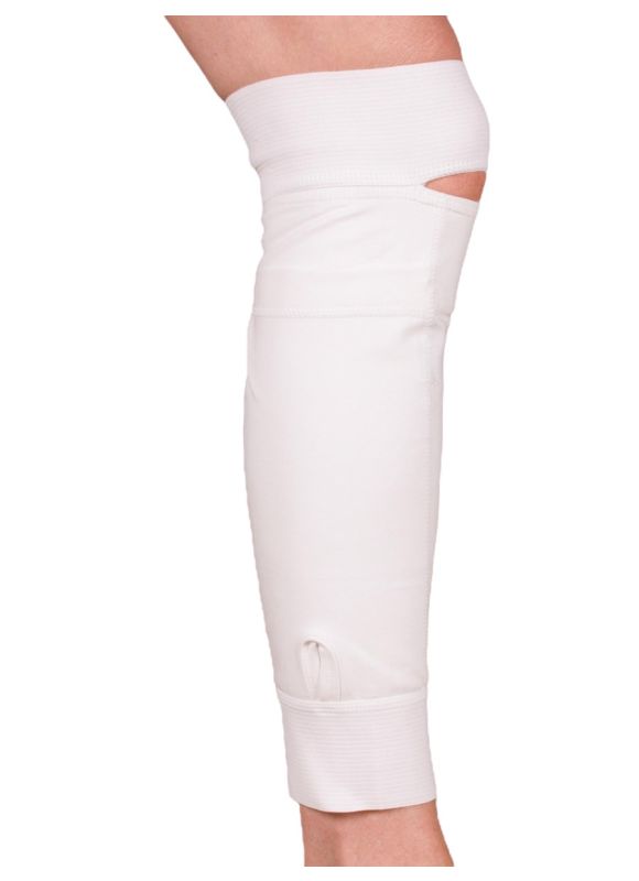 Catheter holder for the calf. Easy to put on, it ensures full mobility for the patient without the catheter slipping off. It clings to skin, and has a thin profile that can be easily covered by trousers so it is not visible under clothes.